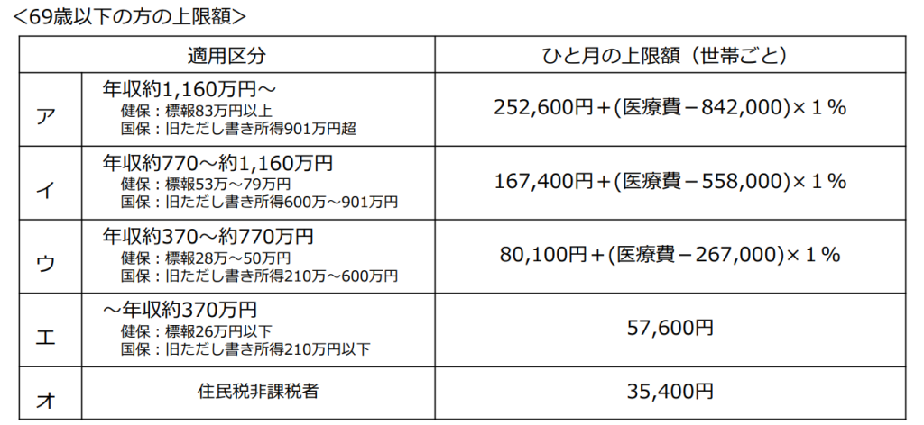 「高額療養費制度」とは、ひと月に支払った保険診療の自己負担が上限額を超えたときに超過分が払い戻される制度です。ひと月あたりの上限額は年収や年齢により区分され、例えば69歳以下の方の場合の上限額は次の表の通りです。