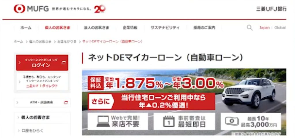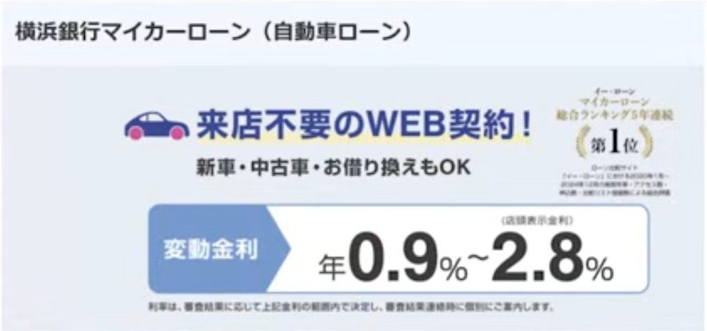 千葉銀行と同じ最安金利ですが、上限金利が2.8%のため第1位に選ばれました。営業エリアは神奈川県全域と東京・群馬の一部で利用可能です。全国対応ではありませんが、利用可能エリアの方にとっては最もお得なマイカーローンと言えます。