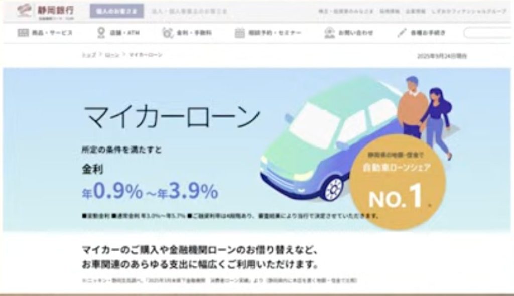 静岡県には駿河銀行や清水銀行もありますが、規模としてトップなのが静岡銀行です。ホームページでも自動車ローンがエリアNo.1であることを謳っており、実績の高さがうかがえます。