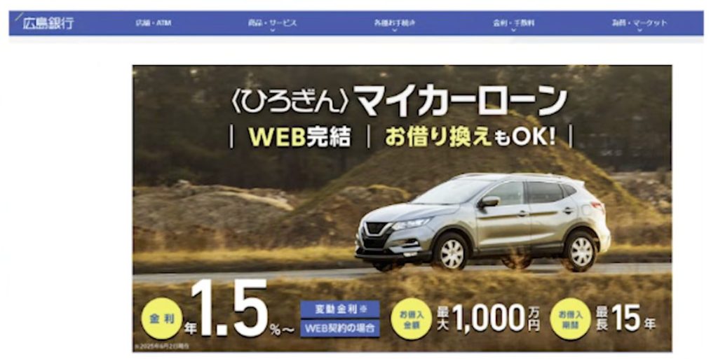 広島県呉市エリア限定のローンです。信用金庫がランクインしている点にも注目です。実は銀行だけでなく信用金庫にもマイカーローンがあり、ネットで申し込み可能なケースも多いです。地域密着型ならではのサービスを提供している場合もあるため、地元の信用金庫も選択肢に加える価値があります。